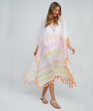 Apple shapes will adore this pink zig-zag print maxi cover-up. The vertical patterns and flowy fabric help elongate your figure while the tassel trim adds a playful touch without adding bulk around the midsection. This cover-up offers a breezy fit that’s perfect for staying comfortable and stylish.
