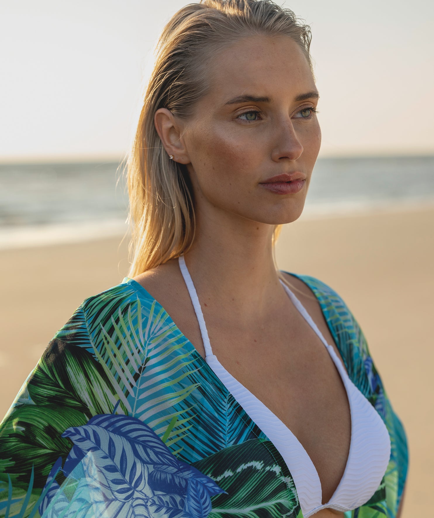 Featuring a bold tropical palm leaves print in vibrant turquoise for a playful, resort-ready look.