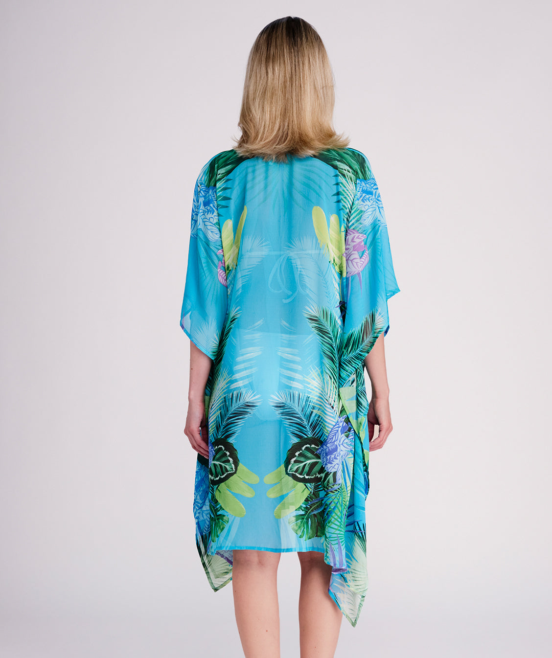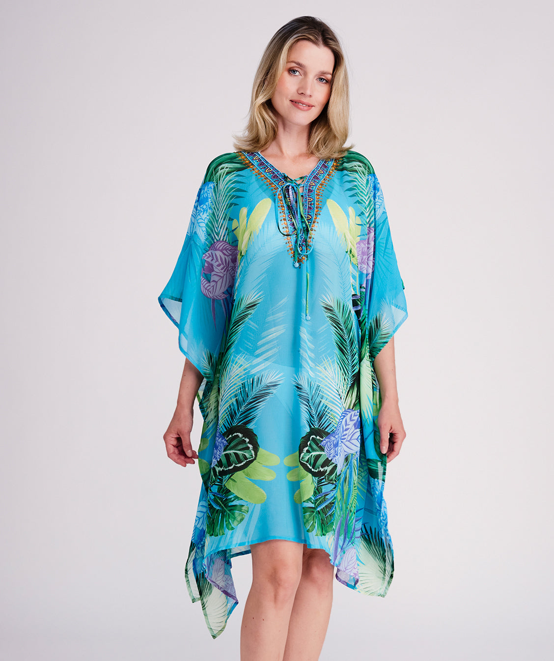 The Marbella Turquoise Tropical Print Summer Kaftan is a vibrant and stylish beach cover-up.