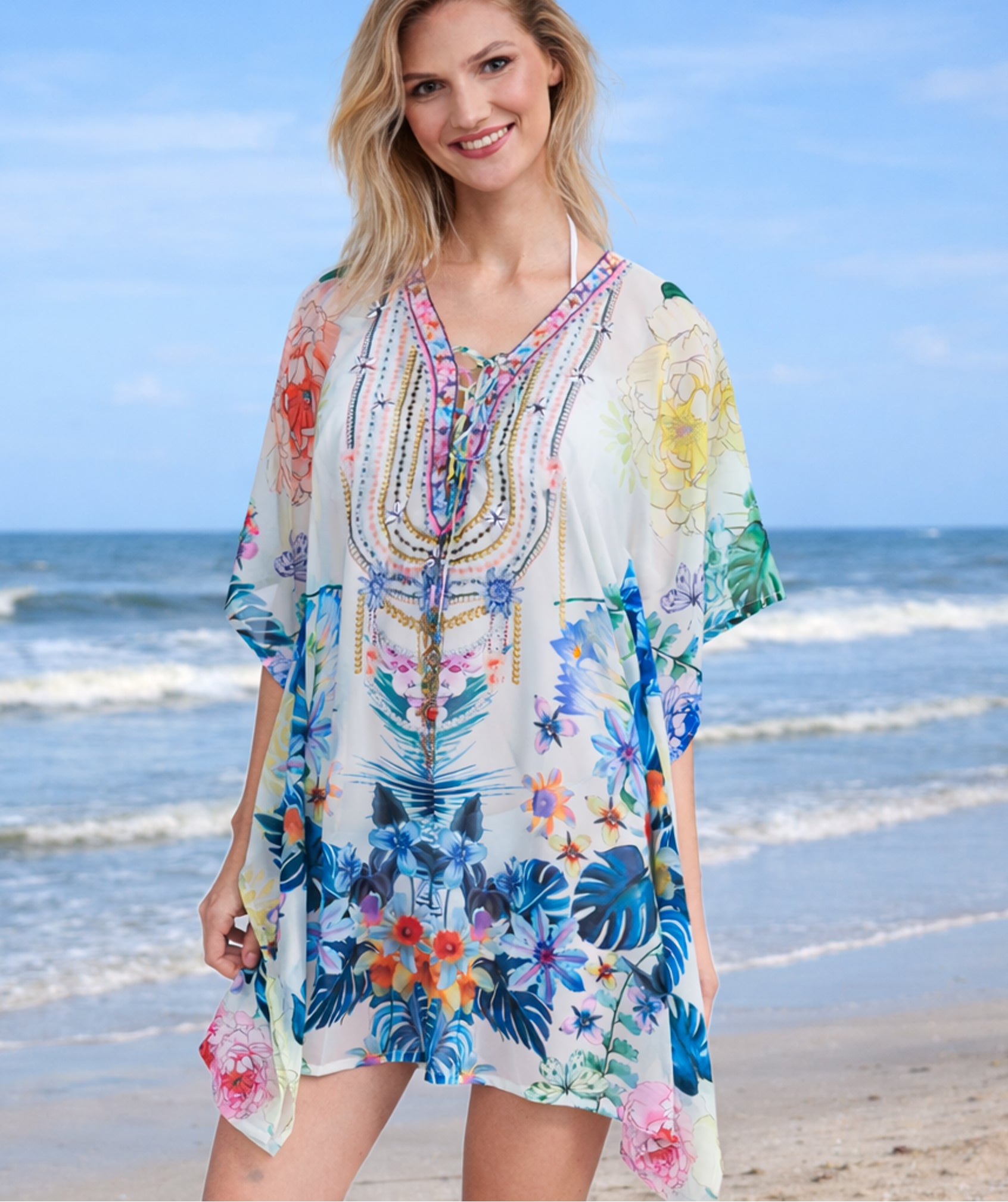 Get ready to embrace summer with our Paradiso Cover Up in a stunning blue floral tropical print. This midi-length cover-up is made from a lightweight, crease-free fabric, making it perfect for vacations or poolside lounging. The elegant shape and sparkling embellishments add a touch of glamour, while the feminine floral print adds a fresh and vibrant touch. Stay stylish and comfortable with this must-have summer accessory.