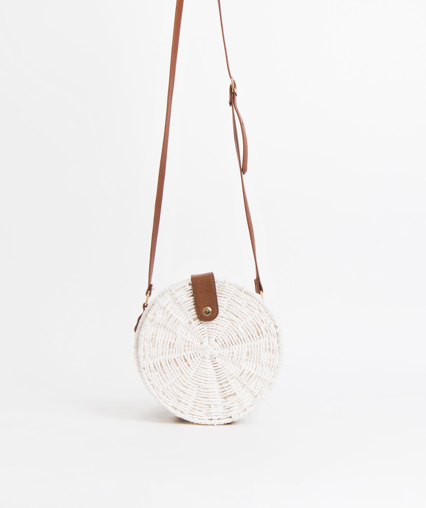 This is the lightweight, summer shoulder or crossbody bag you will want for summer strolling and holiday getaways. Perfectly suited for sunny exploration, this White Circular Rattan Bag is fully lined, so there is never a worry about smaller items escaping the woven design on your travels. The Coco White Round Rattan Bag is just the right size for keeping your essentials on the go. The super structured box design has a depth of 8 cm which means it`s wide enough to tuck in purses, slim travel guides and mobile phones.