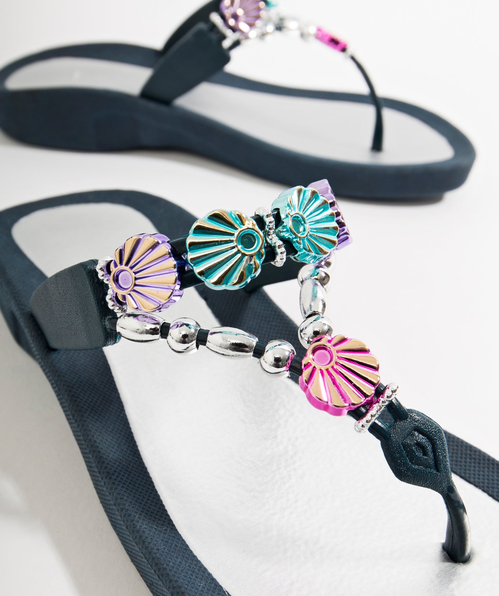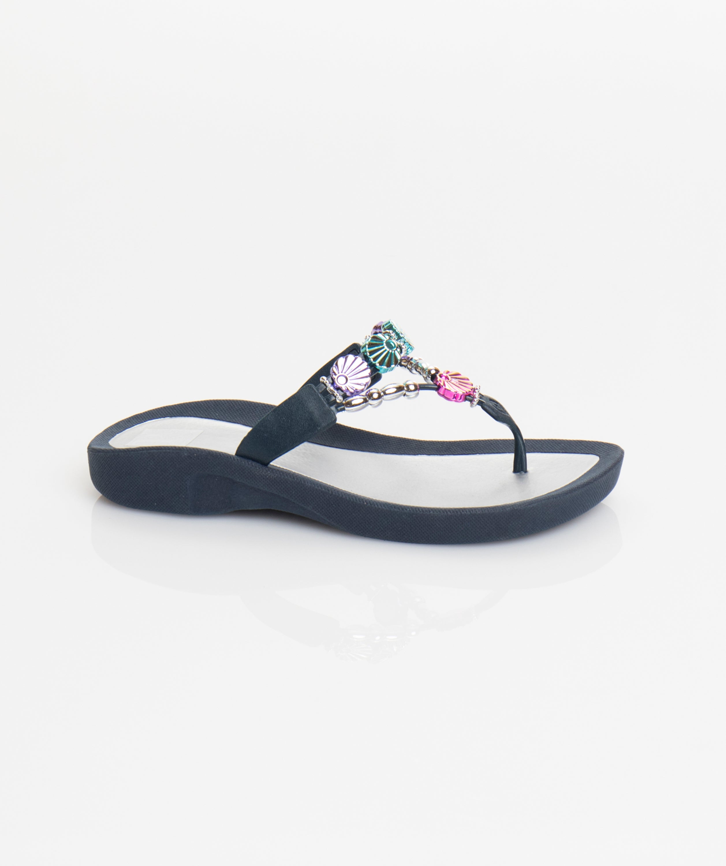 Step into style with our Myriad Pool Shoe in Navy. These wedged embellished shoes are not only fashionable, but also practical with their non-slip sole. The versatile toe post sandal features a padded insole for extra comfort, while the glamorous embellishments add a touch of glam to any outfit.