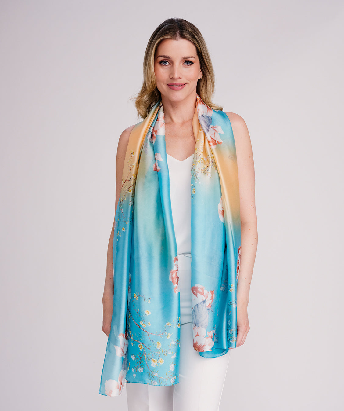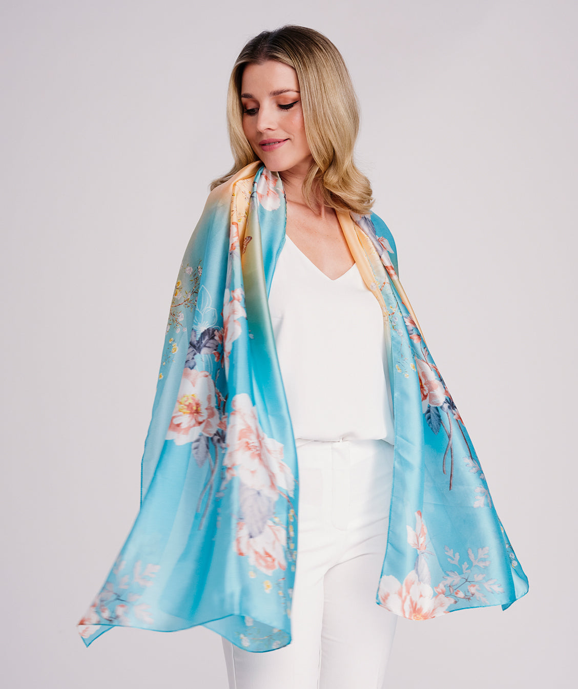 Fester seidiger Stoff, schöne Mischung aus blassem Türkis und sanften Cremetönen, fertiger Saum