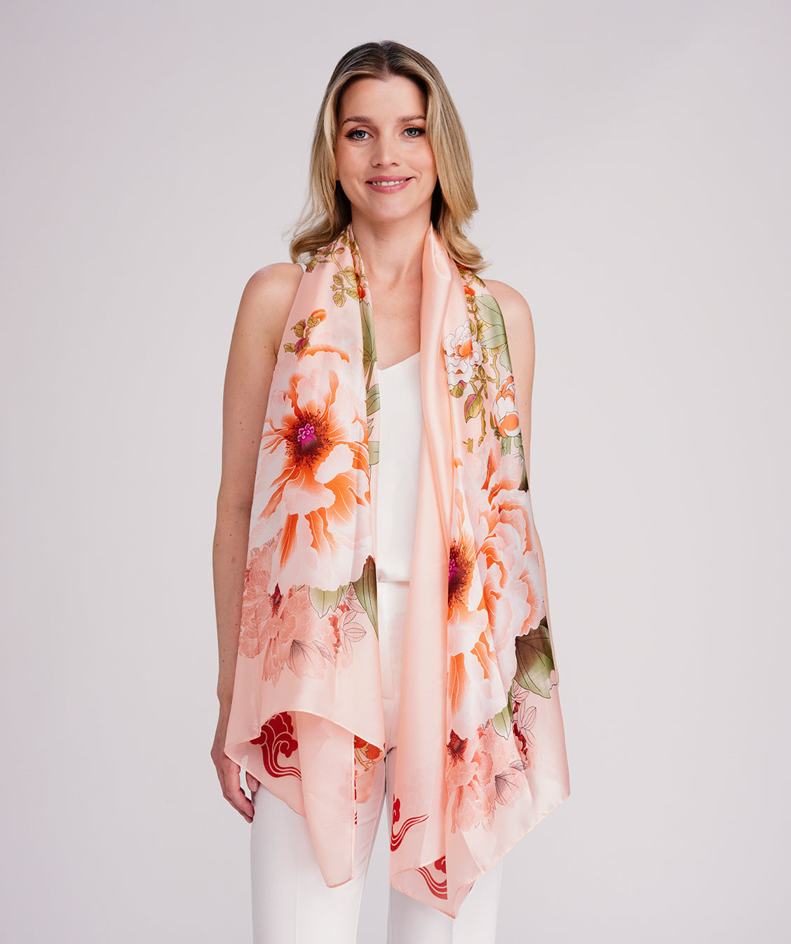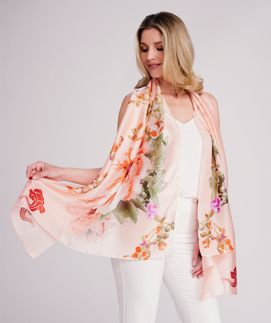 Abstrakter Blumendruck, seidiger Stoff, wunderschöne Rosatöne, fertiger Saum