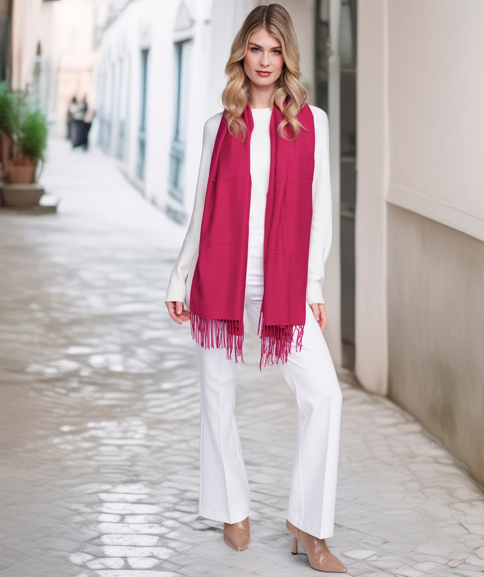 Disfrute de la lujosa comodidad de nuestra Pashmina Pia en color burdeos. Hecha en Italia, esta bufanda estilo pashmina presenta un tejido suave al tacto y está adornada con delicados flecos. Su clásica forma oblonga extragrande añade un toque elegante a cualquier atuendo y está disponible en una variedad de colores deslumbrantes. Envuélvase en calidez y estilo con este accesorio imprescindible.