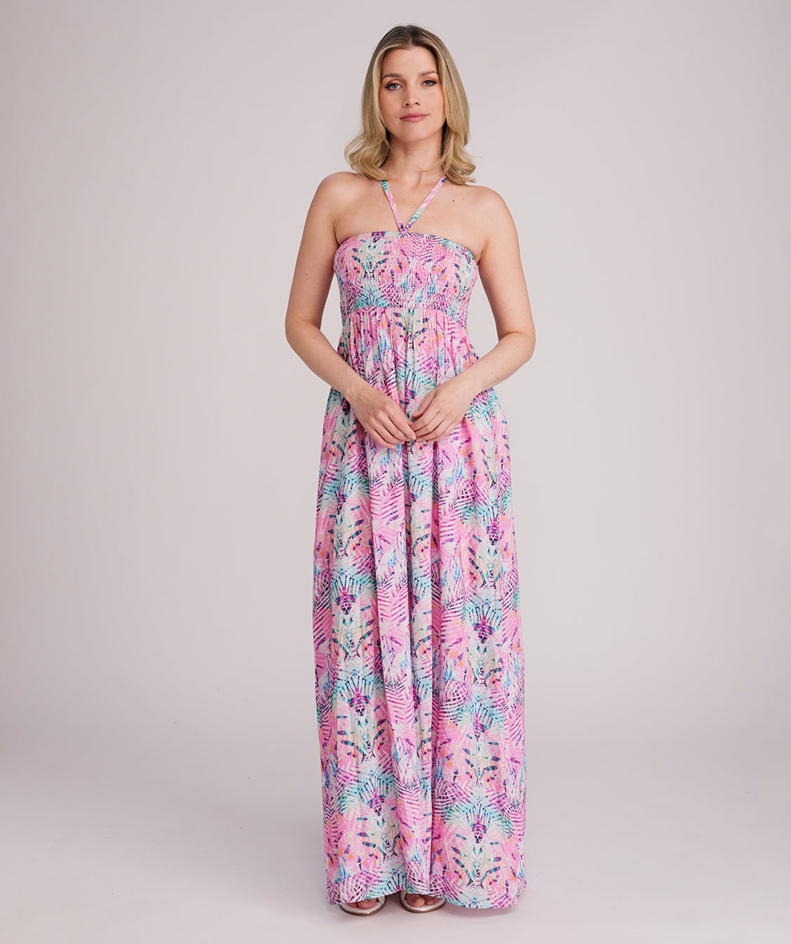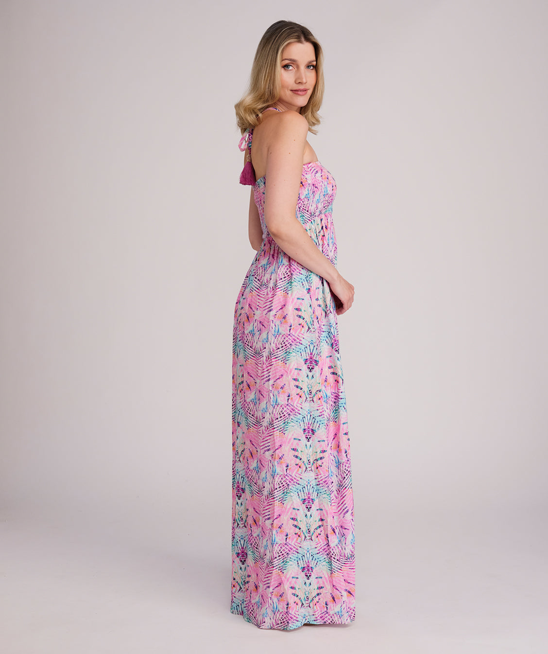 Apresentamos o Vestido Maxi Barbados em Rosa da Pia Rossini. Este vestido com estampa de folhas tropicais apresenta um design com estampa digital e faixa elástica para fácil deslizamento. Feito em lindo tecido de viscose, este vestido maxi é estiloso e confortável para qualquer ocasião. Garanta já o seu para um look chique de verão!