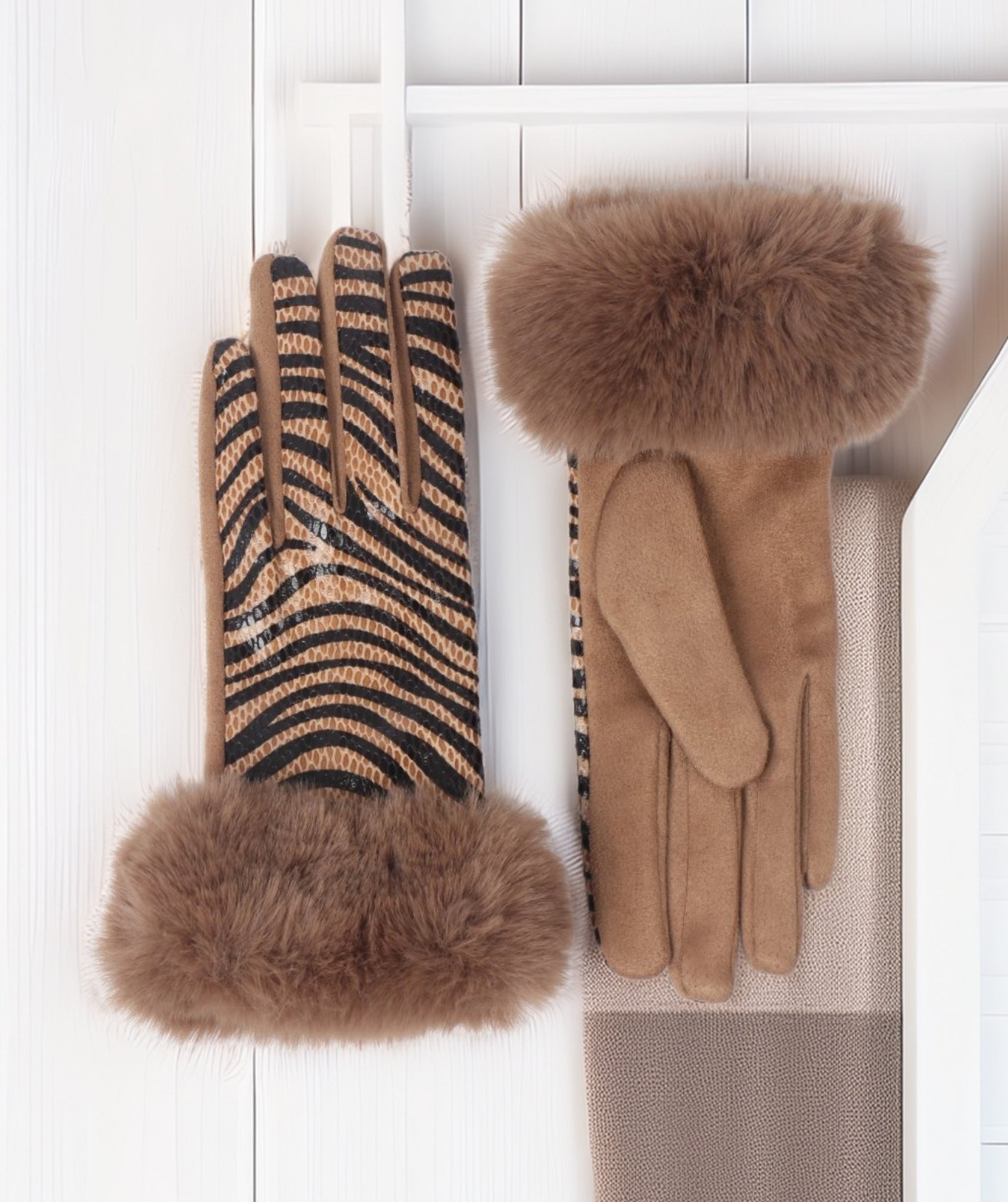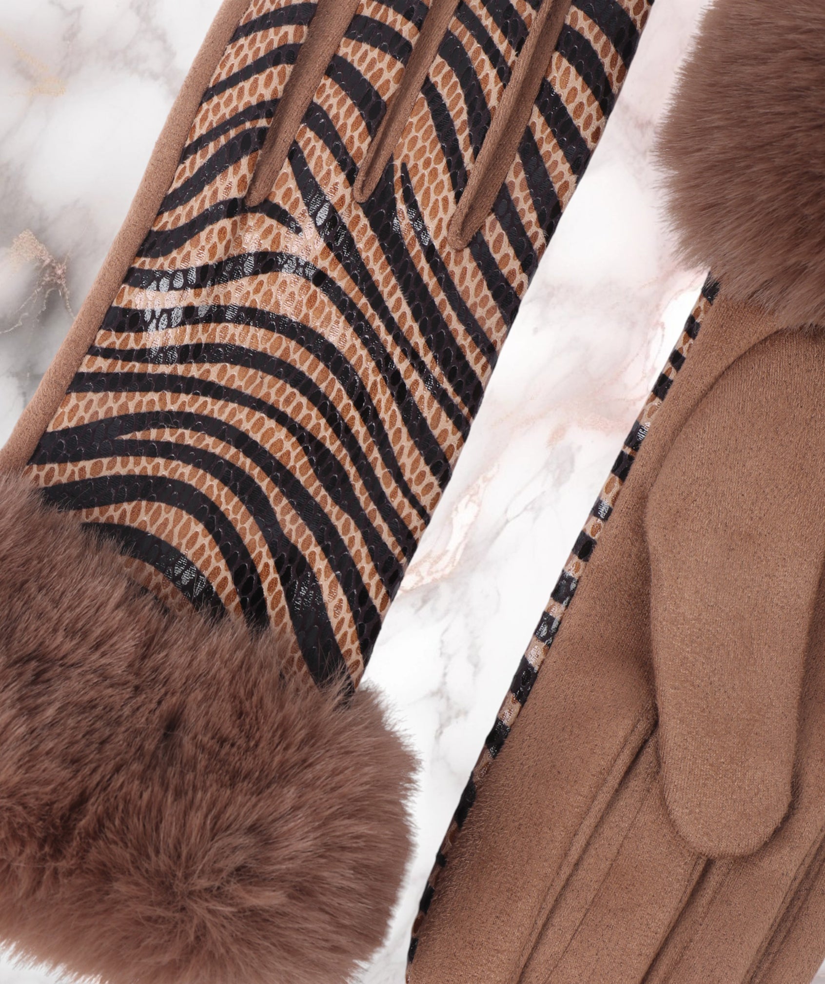 As luvas Finley com estampa animal e punho de pele sintética são um par de luvas maravilhoso para quem gosta de estampas. Com corpo de camurça sintética e detalhes em PU com estampa animal, essas luvas neutras certamente serão suas peças mais quentes no inverno. Um punho de pele sintética incrivelmente macio e aconchegante envolve suas mãos e possui um forro supermacio para total conforto. Este par de luvas tamanho único é ideal para guardar na bolsa quando o frio chegar. O acabamento em PU brilhante confere-lhes um visual ainda mais moderno e é excepcional para saídas à noite.