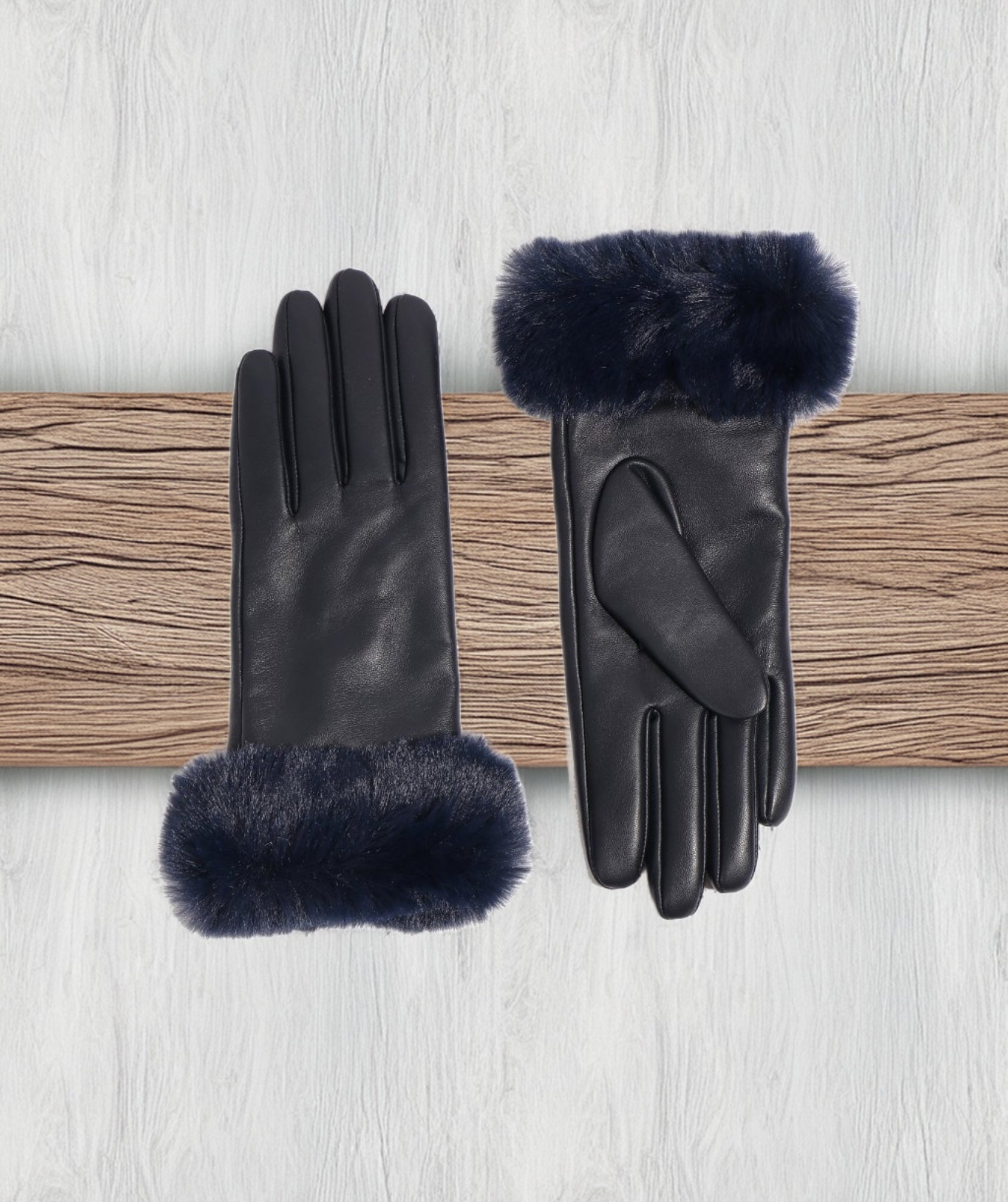 Roma - luvas de couro forradas marinhas com manguito de pele falso